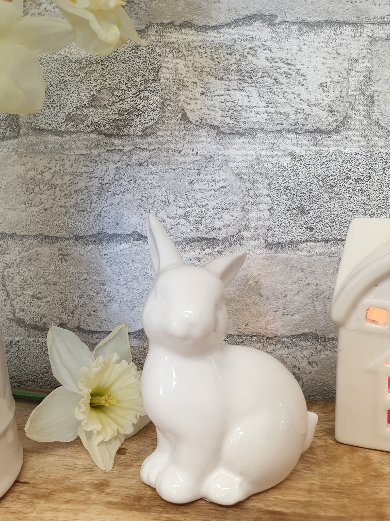 A chic sitting bunny decoration with a classic white glazed finish. A charming finishing touch for the home this season.